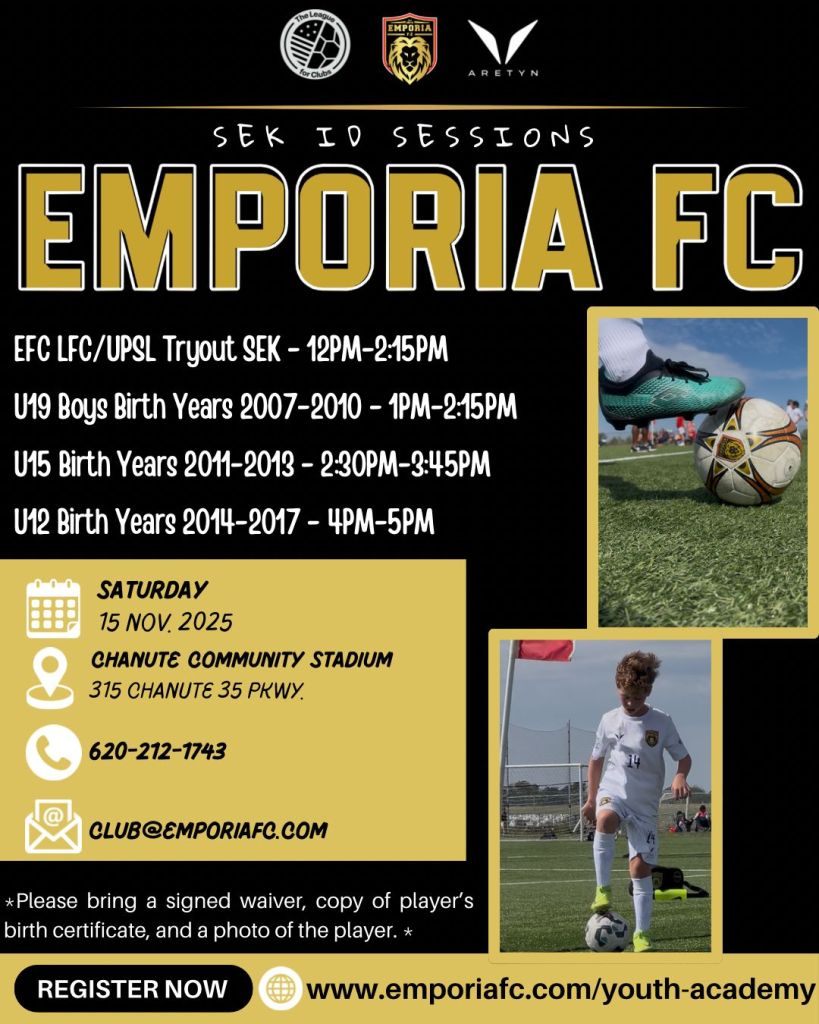 I acknowledge that I will participate in an event/sport that will involve physical activity in which a risk of injury may occur. I specifically, fully, and forever waive and release USD 253 and the Emporia FC board, management, and other participants from liability and claims of damages I may sustain at the event and my travel to/from the event. In the event of an emergency in which I require medical care, I authorize any representative of Emporia FC staff to obtain, for me, necessary medical treatment. A minor must be accompanied by a parent/guardian or signed form.